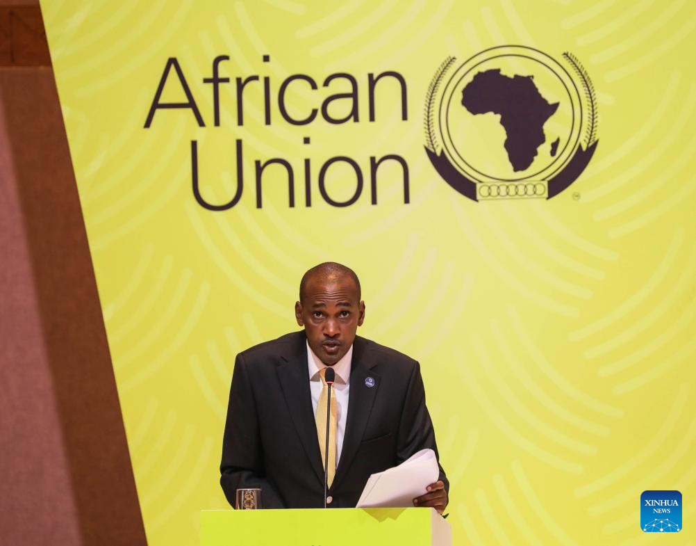 Frank Tumwebaze, Uganda's minister of Agriculture, Animal Industry, and Fisheries, speaks during the official opening of an extraordinary African Union (AU) summit on agriculture in Kampala, Uganda on Jan. 9, 2025. The summit on agriculture opened Thursday in Kampala, the capital of Uganda, as experts and government officials seek measures to boost the continent's development in the sector. (Photo by Hajarah Nalwadda/Xinhua)