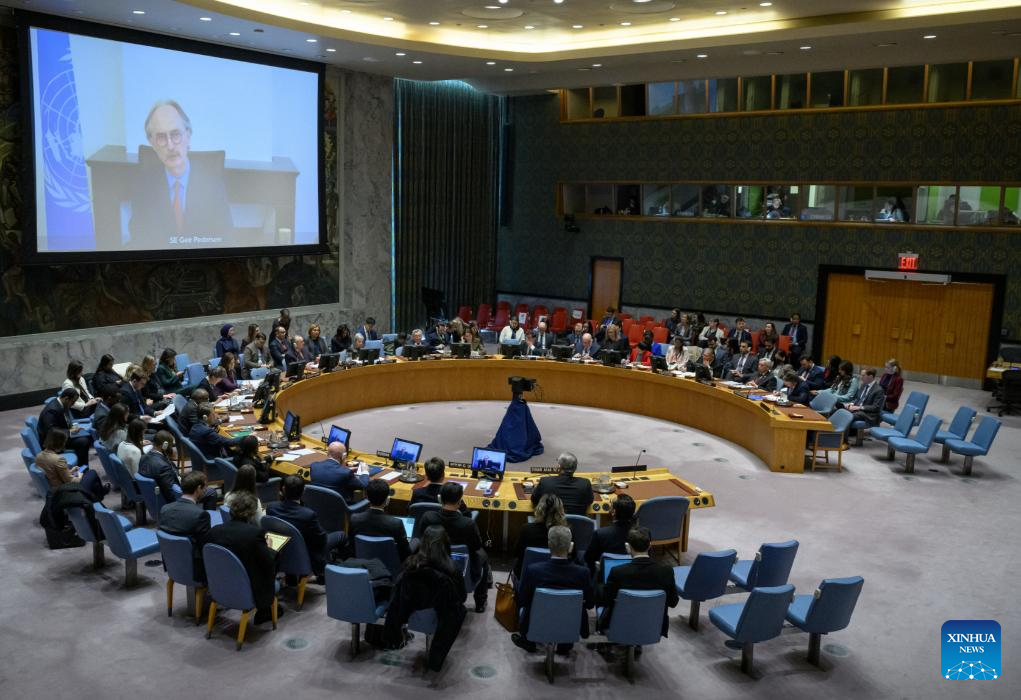 Geir Pedersen (on screen), UN special envoy for Syria, briefs the Security Council meeting on Syria at the UN headquarters in New York, Jan. 8, 2025. The United Nations is ready to work with the Syrian interim government on advancing towards a credible and inclusive political transition, the UN special envoy said on Wednesday. (Loey Felipe/UN Photo/Handout via Xinhua)