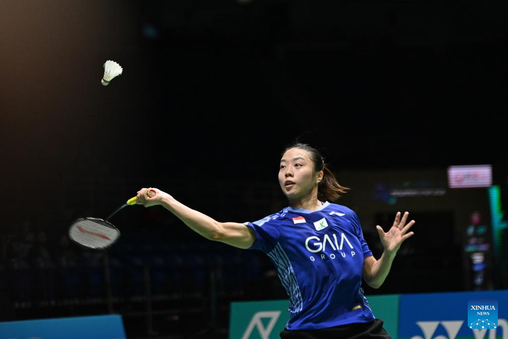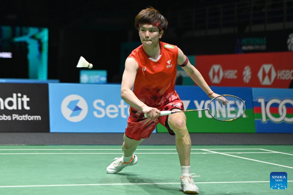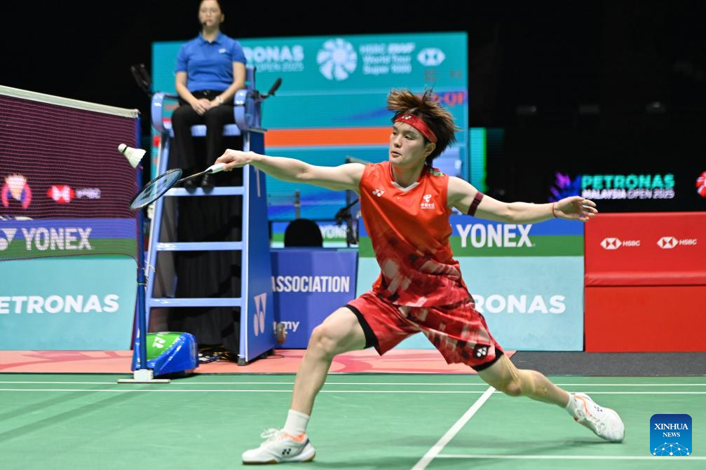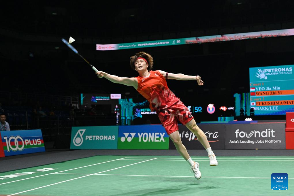 Wang Zhiyi hits a return during the women's singles quarterfinal match between Wang Zhiyi of China and Yeo Jia Min of Singapore at the Malaysia Open 2025 badminton tournament in Kuala Lumpur, Malaysia, Jan. 10, 2025. (Photo by Chong Voon Chung/Xinhua)