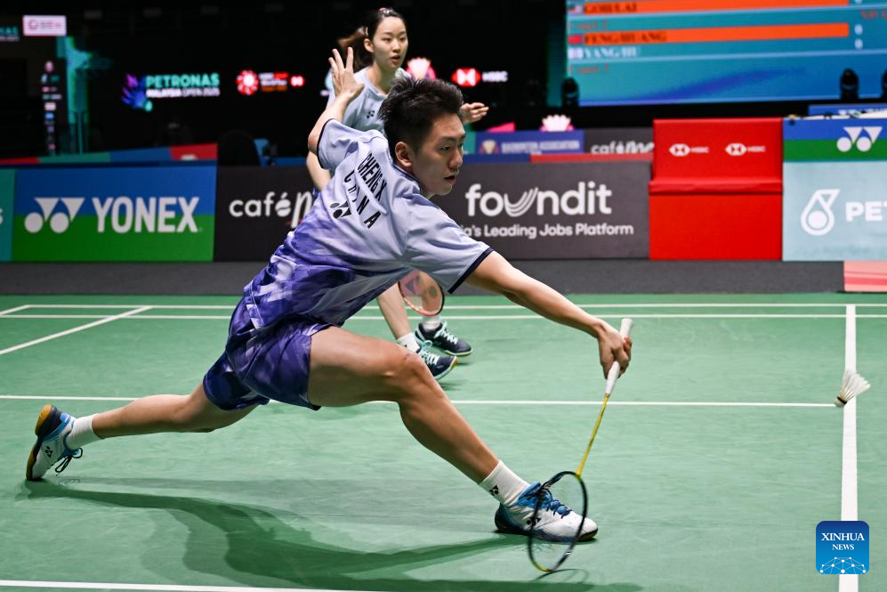 Feng Yanzhe (L)/Huang Dongping compete during the mixed doubles quarterfinal match between Feng Yanzhe/Huang Dongping of China and Yang Po-Hsuan/Hu Ling Fang of Chinese Taipei at the Malaysia Open 2025 badminton tournament in Kuala Lumpur, Malaysia, Jan. 10, 2025. (Photo by Chong Voon Chung/Xinhua)