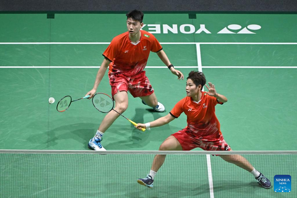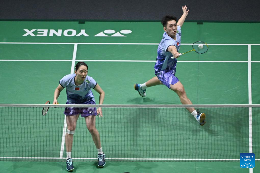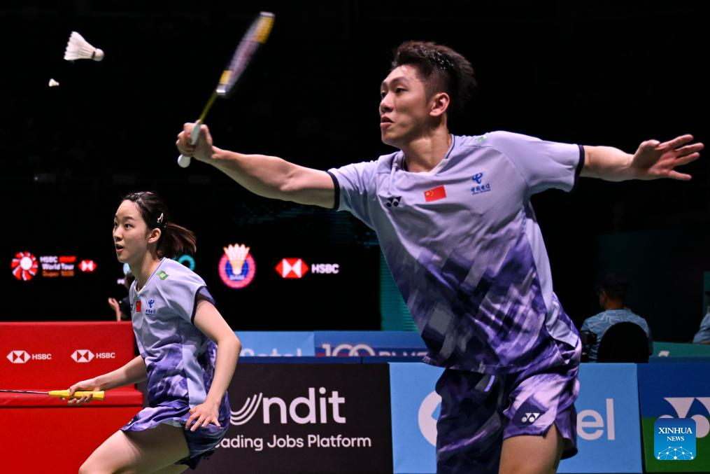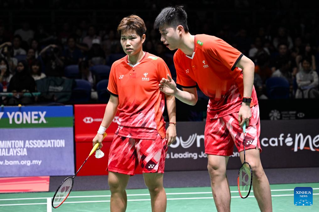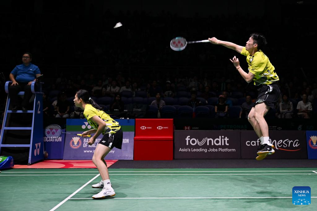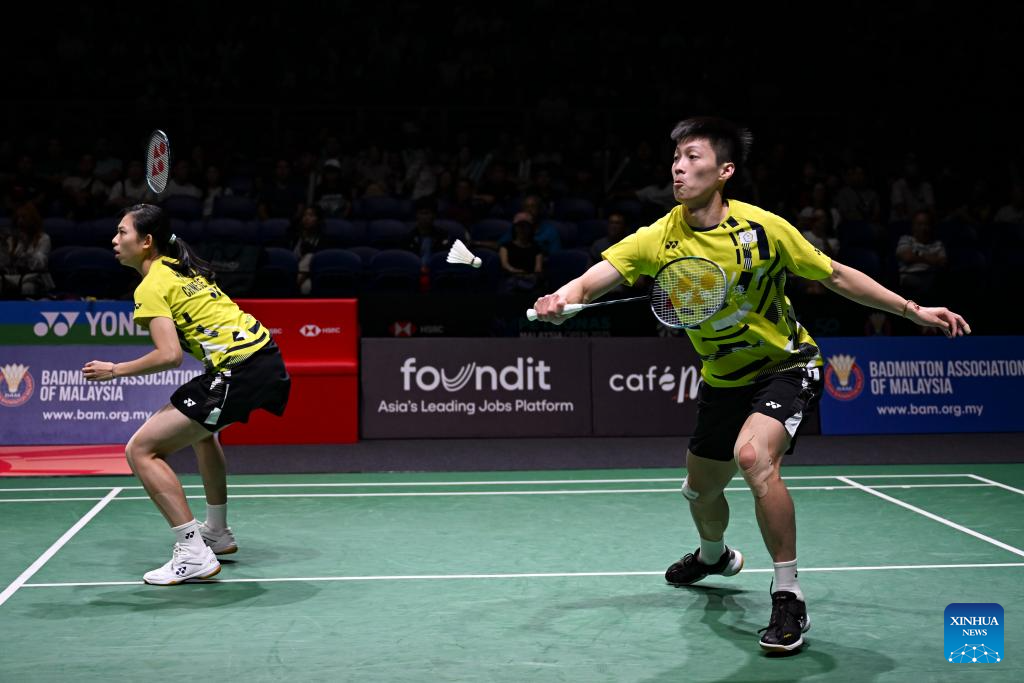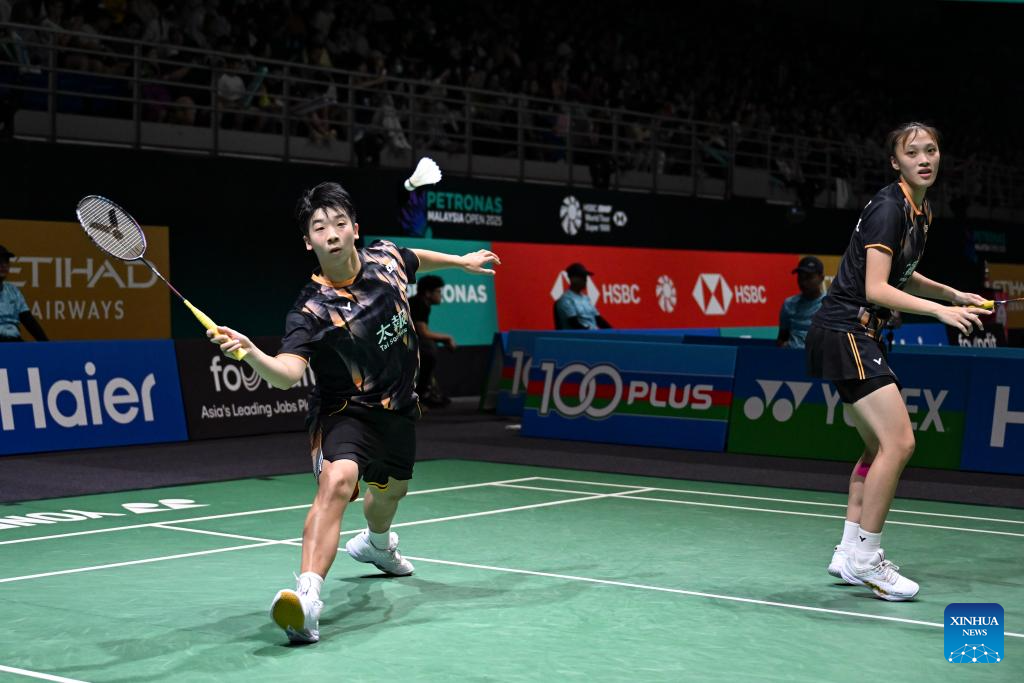 Cheng Xing (R)/Zhang Chi of China compete during the mixed doubles quarterfinal between Cheng Xing/Zhang Chi of China and Goh Soon Huat/Lai Shevon Jemie of Malaysia at the Malaysia Open 2025 badminton tournament in Kuala Lumpur, Malaysia, Jan. 10, 2025. (Xinhua/Cheng Yiheng)