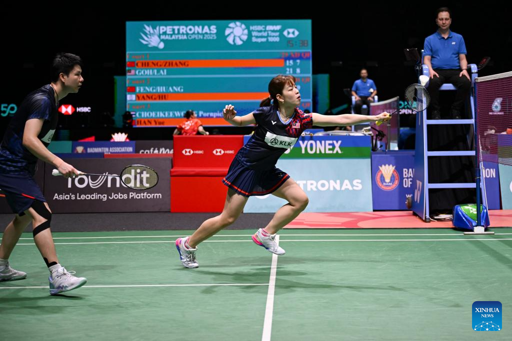 Goh Soon Huat/Lai Shevon Jemie (R) of Malaysia compete during the mixed doubles quarterfinal between Cheng Xing/Zhang Chi of China and Goh Soon Huat/Lai Shevon Jemie of Malaysia at the Malaysia Open 2025 badminton tournament in Kuala Lumpur, Malaysia, Jan. 10, 2025. (Xinhua/Cheng Yiheng)