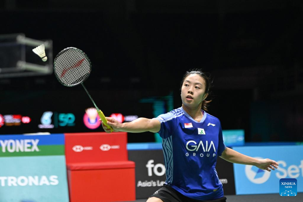 Yeo Jia Min hits a return during the women's singles quarterfinal match between Wang Zhiyi of China and Yeo Jia Min of Singapore at the Malaysia Open 2025 badminton tournament in Kuala Lumpur, Malaysia, Jan. 10, 2025. (Photo by Chong Voon Chung/Xinhua)