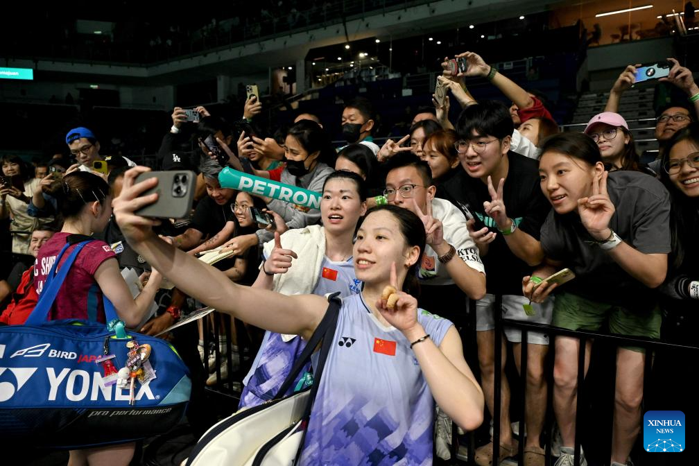 Li Yijing (front)/Luo Xumin of China take selfies with fans after the women's doubles quarterfinal against Matsutomo Misaki/Chiharu Shida of Japan at the Malaysia Open 2025 badminton tournament in Kuala Lumpur, Malaysia, Jan. 10, 2025. (Photo by Chong Voon Chung/Xinhua)