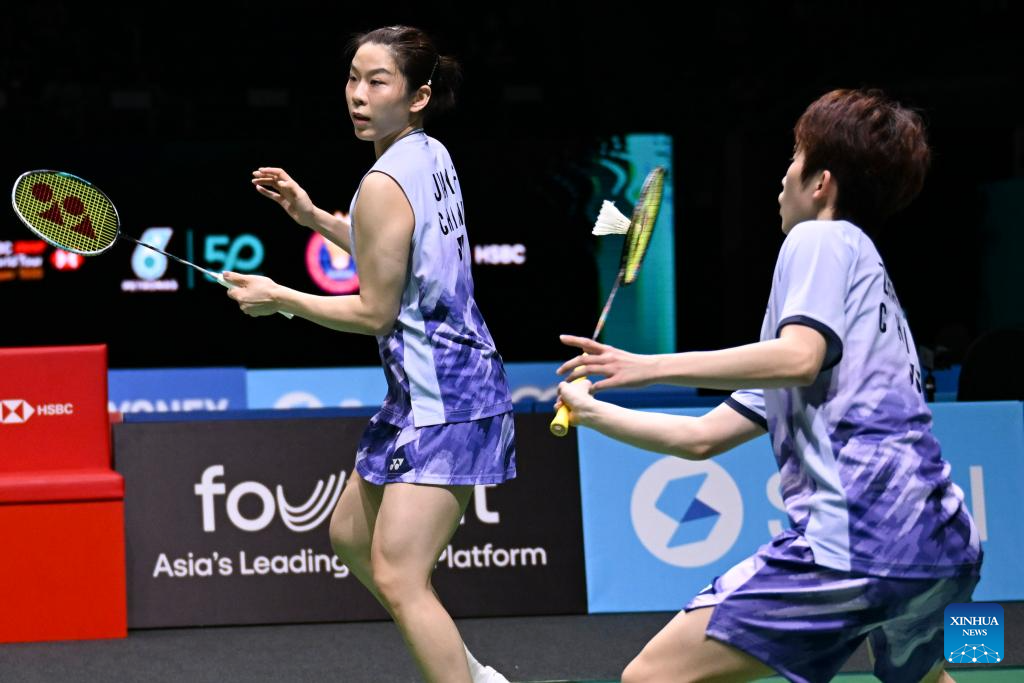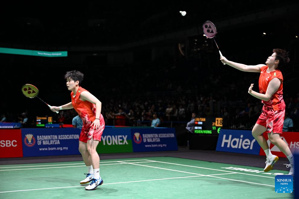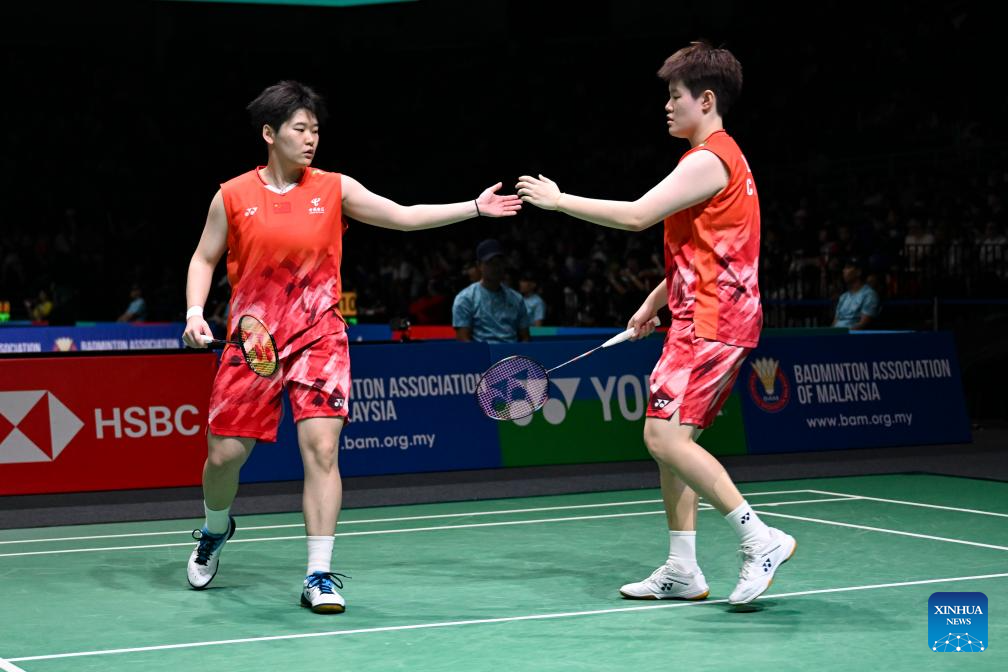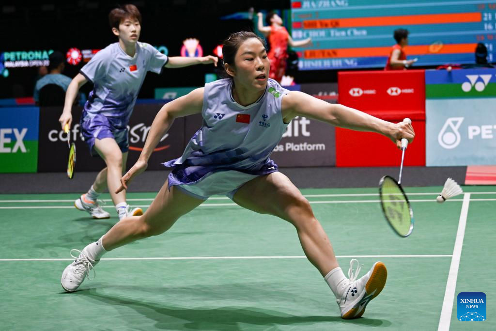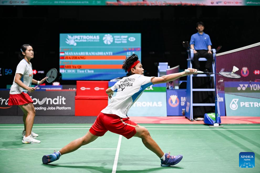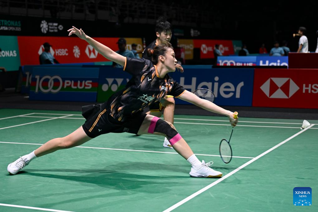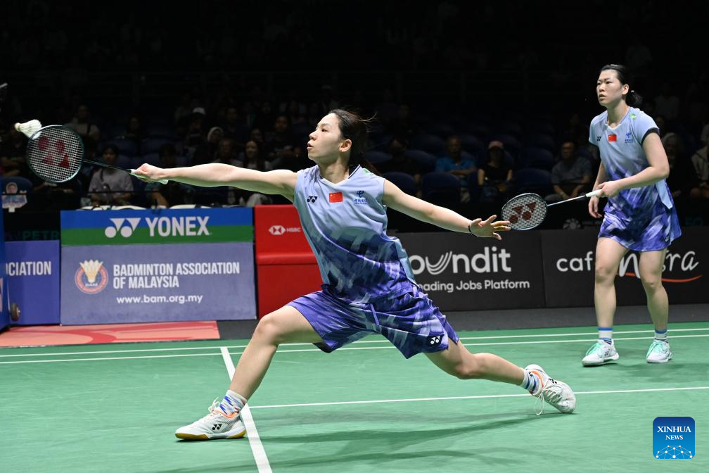 Jia Yifan/Zhang Shuxian (R) of China compete during the women's doubles quarterfinal between Jia Yifan/Zhang Shuxian of China and Lanny Tria Mayasari/Siti Fadia Silva Ramadhanti of Indonesia at the Malaysia Open 2025 badminton tournament in Kuala Lumpur, Malaysia, Jan. 10, 2025. (Xinhua/Cheng Yiheng)