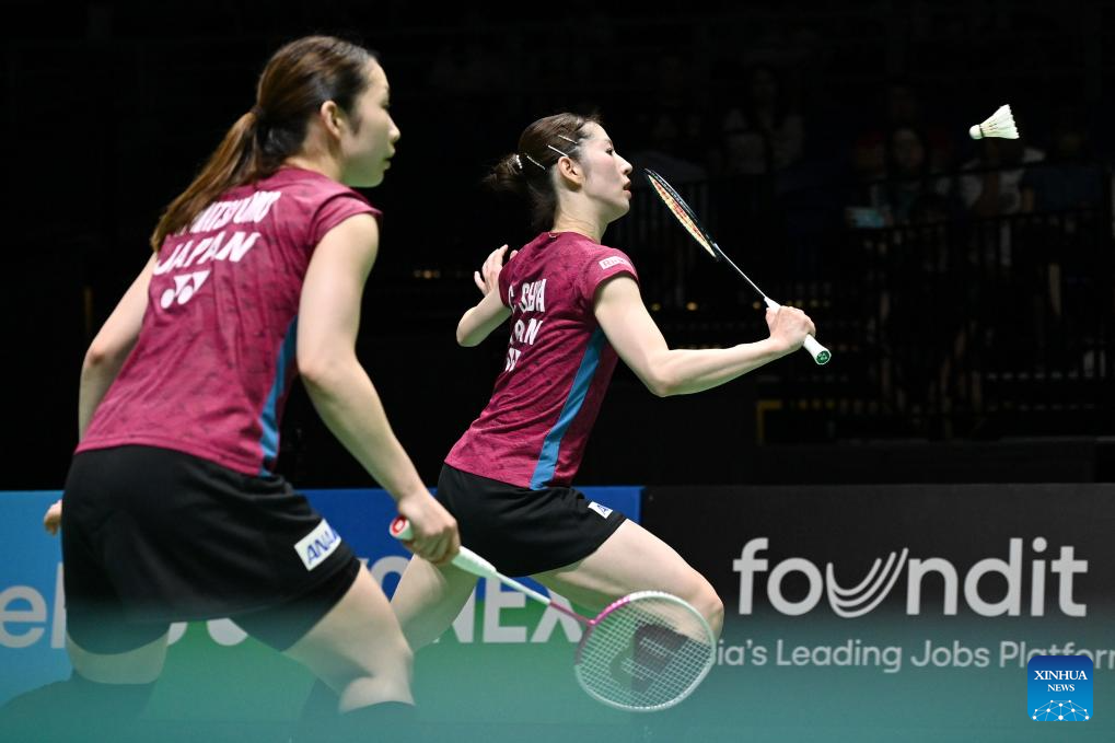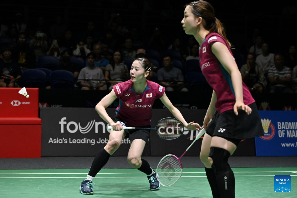 Matsutomo Misaki/Chiharu Shida (R) of Japan compete during the women's doubles quarterfinal against Li Yijing/Luo Xumin of China at the Malaysia Open 2025 badminton tournament in Kuala Lumpur, Malaysia, Jan. 10, 2025. (Photo by Chong Voon Chung/Xinhua)