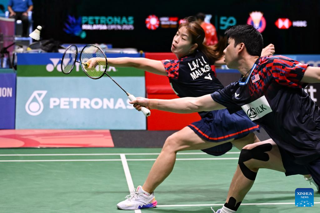 Goh Soon Huat/Lai Shevon Jemie (L) of Malaysia compete during the mixed doubles quarterfinal between Cheng Xing/Zhang Chi of China and Goh Soon Huat/Lai Shevon Jemie of Malaysia at the Malaysia Open 2025 badminton tournament in Kuala Lumpur, Malaysia, Jan. 10, 2025. (Xinhua/Cheng Yiheng)