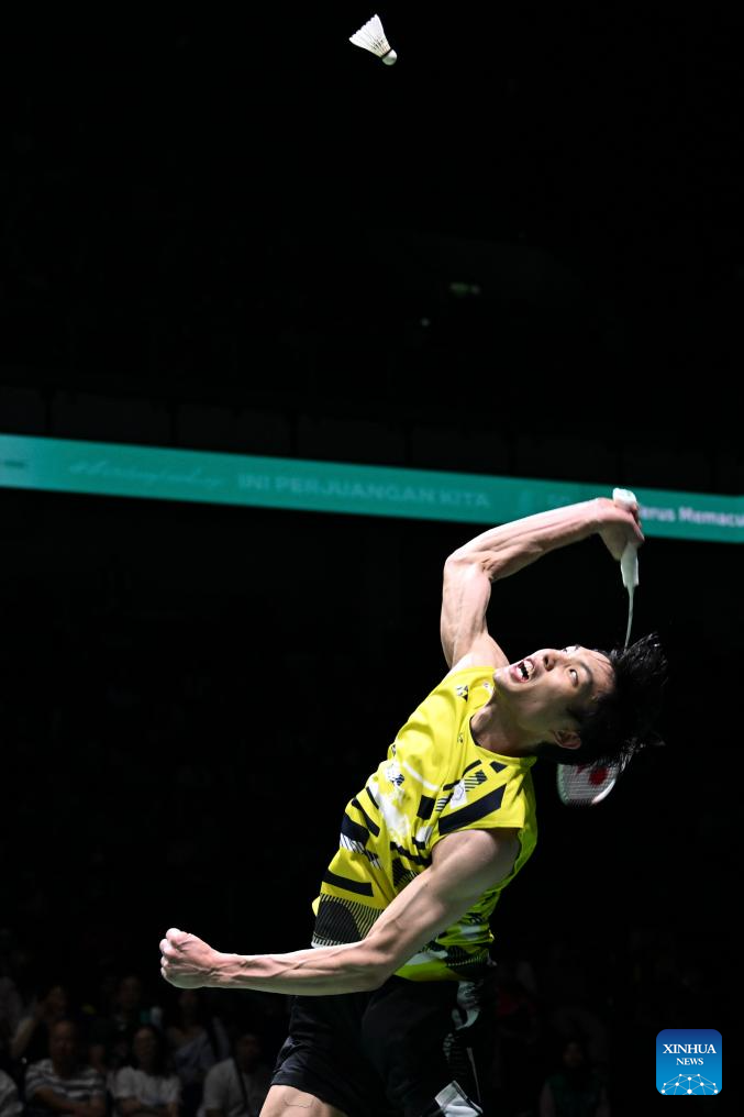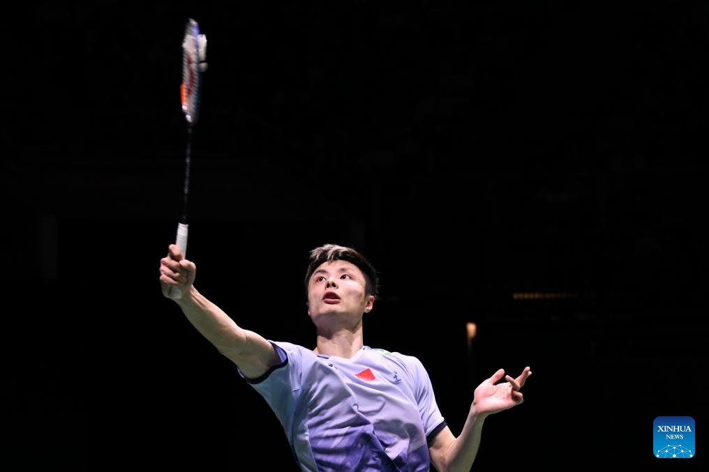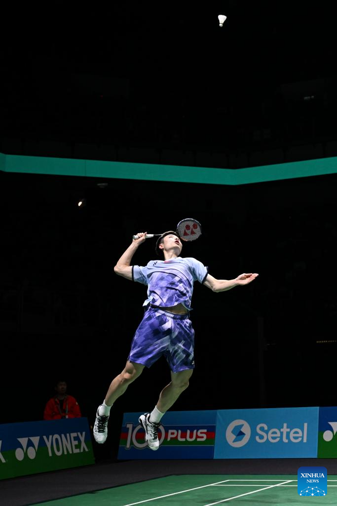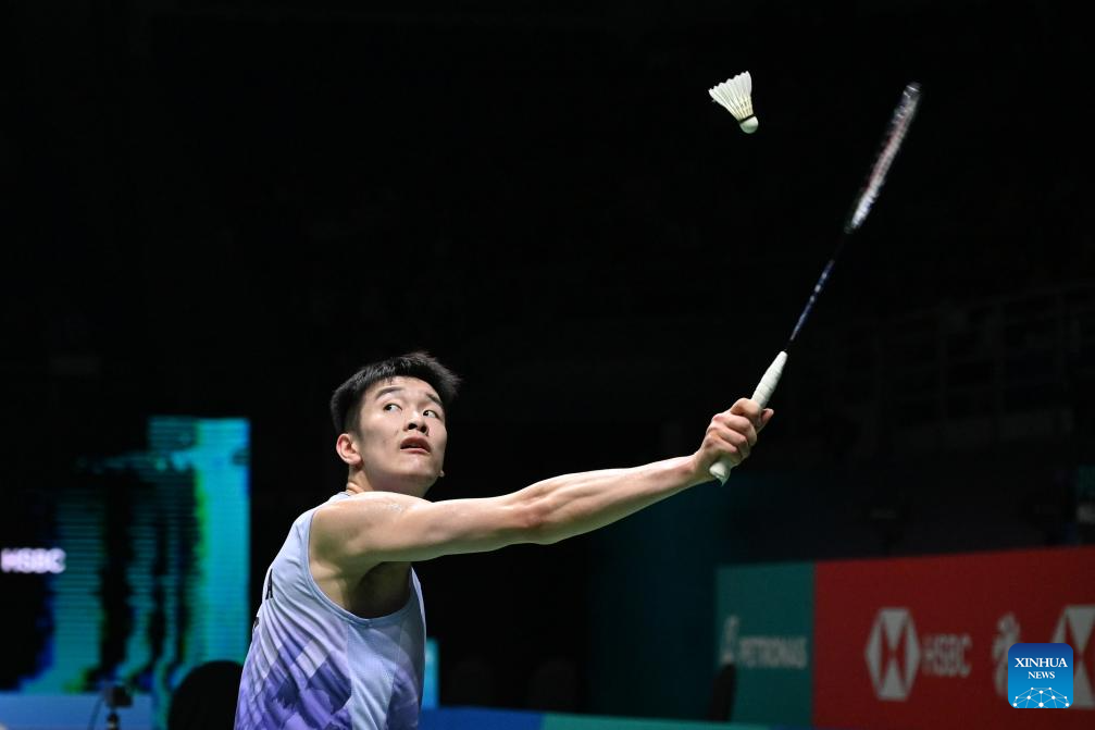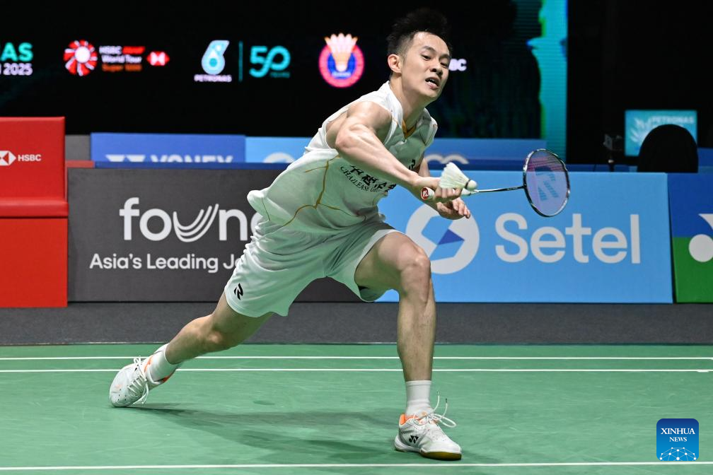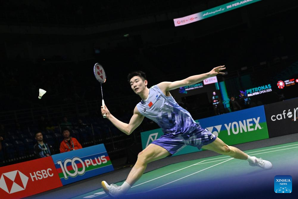 Shi Yuqi of China hits a return during the men's singles quarterfinal between Shi Yuqi of China and Chou Tien-Chen of Chinese Taipei at the Malaysia Open 2025 badminton tournament in Kuala Lumpur, Malaysia, Jan. 10, 2025. (Xinhua/Cheng Yiheng)