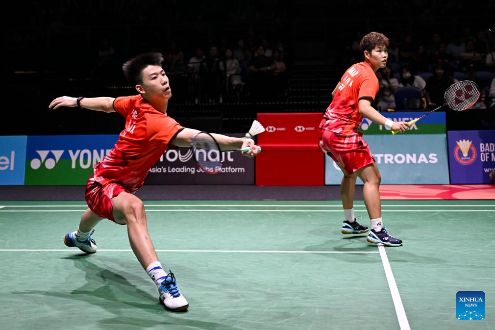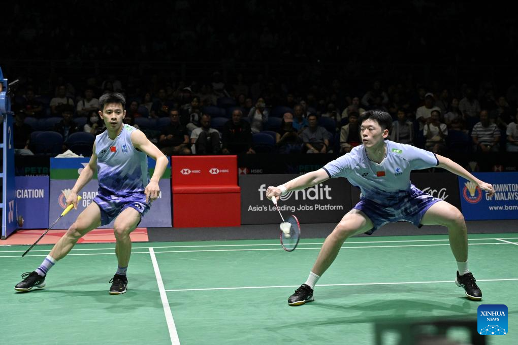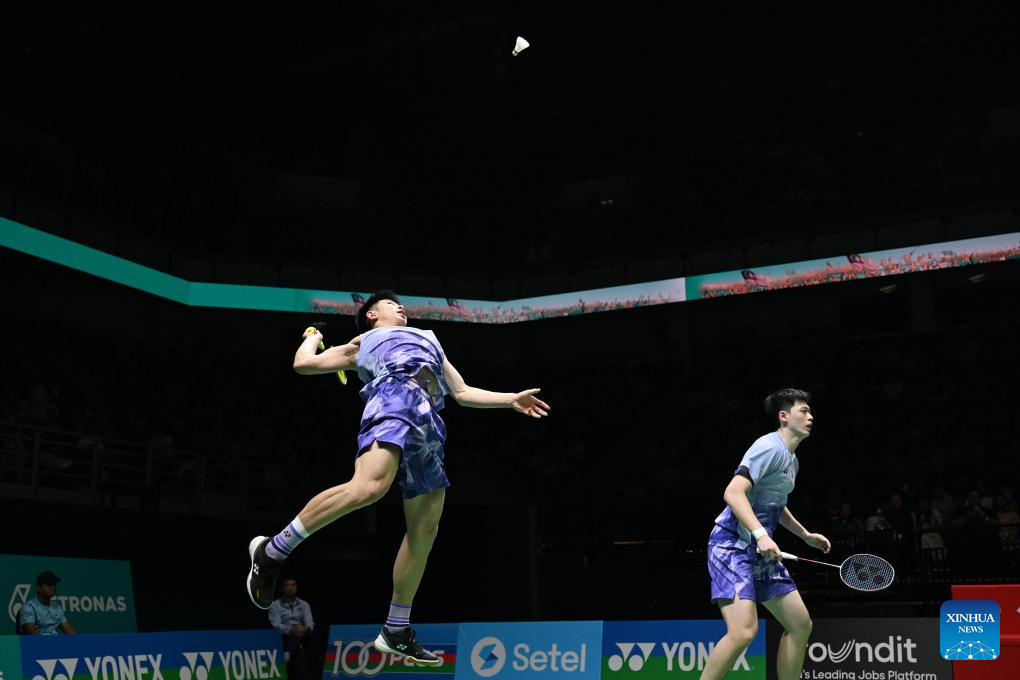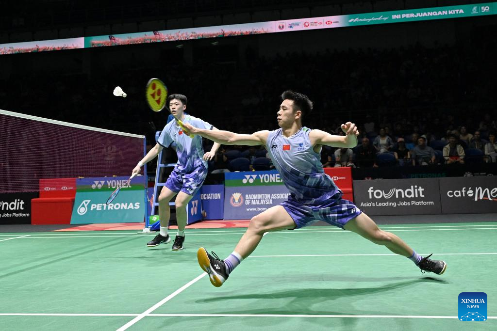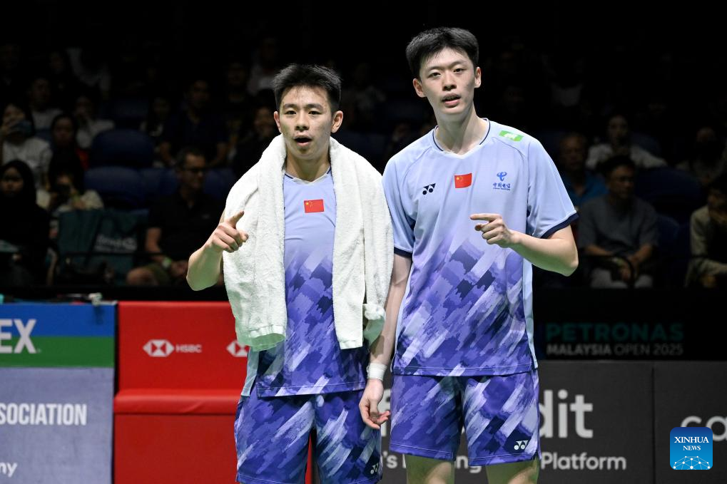 Chen Boyang/Liu Yi (R) of China compete during the men's doubles quarterfinal between Chen Boyang/Liu Yi of China and Ben Lane/Sean Vendy of England at the Malaysia Open 2025 badminton tournament in Kuala Lumpur, Malaysia, Jan. 10, 2025. (Photo by Chong Voon Chung/Xinhua)
