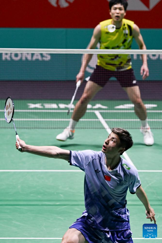 Chen Boyang (R)/Liu Yi of China compete during the men's doubles quarterfinal between Chen Boyang/Liu Yi of China and Ben Lane/Sean Vendy of England at the Malaysia Open 2025 badminton tournament in Kuala Lumpur, Malaysia, Jan. 10, 2025. (Photo by Chong Voon Chung/Xinhua)