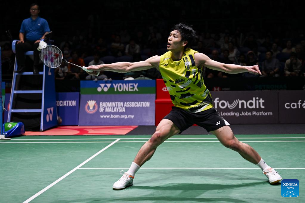 Chou Tien-Chen of Chinese Taipei hits a return during the men's singles quarterfinal between Shi Yuqi of China and Chou Tien-Chen of Chinese Taipei at the Malaysia Open 2025 badminton tournament in Kuala Lumpur, Malaysia, Jan. 10, 2025. (Xinhua/Cheng Yiheng)