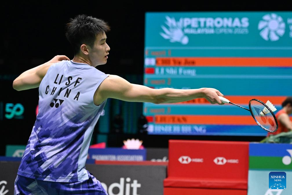 Li Shifeng of China competes during the men's singles quarterfinal between Li Shifeng of China and Chi Yu-Jen of Chinese Taipei at the Malaysia Open 2025 badminton tournament in Kuala Lumpur, Malaysia, Jan. 10, 2025. (Photo by Chong Voon Chung/Xinhua)