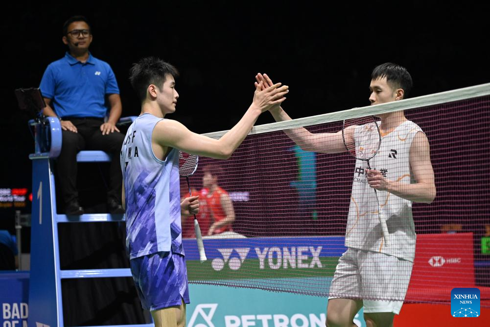 Li Shifeng (L) of China greets Chi Yu-Jen of Chinese Taipei after the men's singles quarterfinal between Li Shifeng of China and Chi Yu-Jen of Chinese Taipei at the Malaysia Open 2025 badminton tournament in Kuala Lumpur, Malaysia, Jan. 10, 2025. (Photo by Chong Voon Chung/Xinhua)
