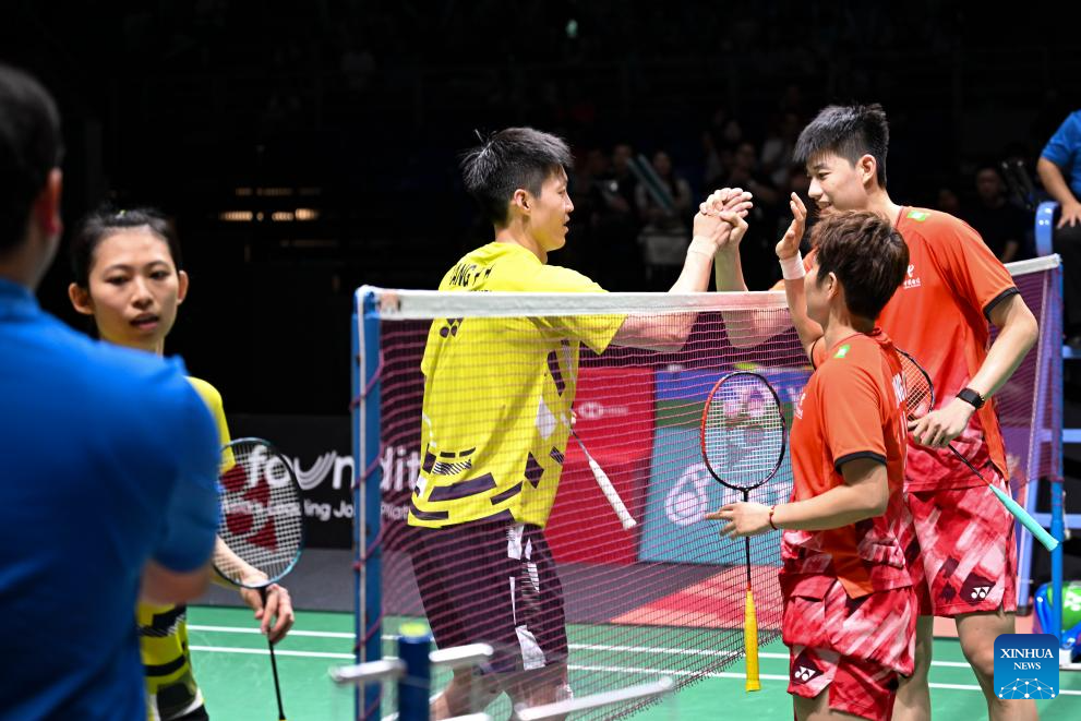 Feng Yanzhe (back R)/Huang Dongping (front R) of China greet Yang Po-Hsuan (3rd R)/Hu Ling Fang of Chinese Taipei after their mixed doubles quarterfinal match at the Malaysia Open 2025 badminton tournament in Kuala Lumpur, Malaysia, Jan. 10, 2025. (Xinhua/Cheng Yiheng)