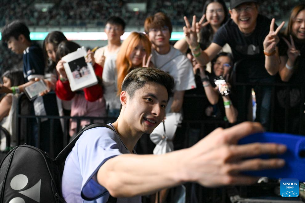 Shi Yuqi of China takes photos with fans after the men's singles quarterfinal between Shi Yuqi of China and Chou Tien-Chen of Chinese Taipei at the Malaysia Open 2025 badminton tournament in Kuala Lumpur, Malaysia, Jan. 10, 2025. (Xinhua/Cheng Yiheng)