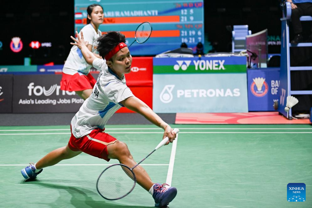 Lanny Tria Mayasari/Siti Fadia Silva Ramadhanti (R) of Indonesia compete during the women's doubles quarterfinal between Jia Yifan/Zhang Shuxian of China and Lanny Tria Mayasari/Siti Fadia Silva Ramadhanti of Indonesia at the Malaysia Open 2025 badminton tournament in Kuala Lumpur, Malaysia, Jan. 10, 2025. (Xinhua/Cheng Yiheng)