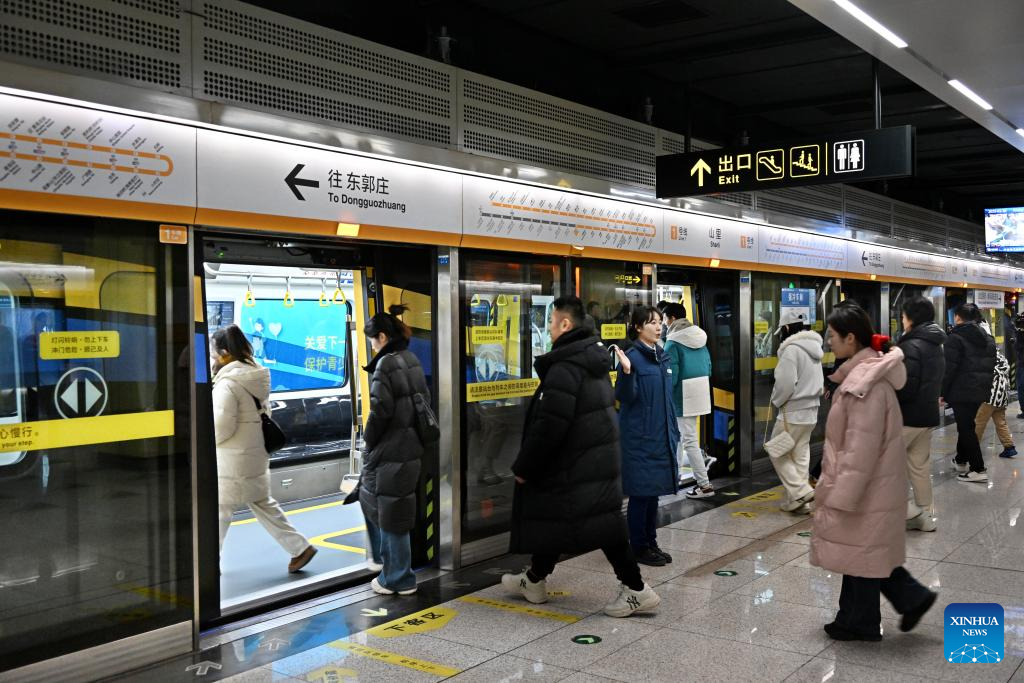 Passengers take a CETROVO 1.0 metro train on the Metro Line 1 in Qingdao, east China's Shandong Province, Jan. 10, 2025. The CETROVO 1.0 subway car started its operation on the Qingdao Metro Line 1 on Friday.