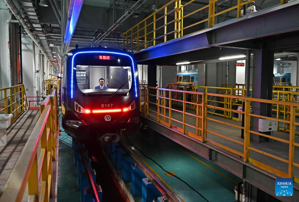 This photo taken on Jan. 10, 2025 shows a CETROVO 1.0 metro train before its operation in Qingdao, east China's Shandong Province. The CETROVO 1.0 subway car started its operation on the Qingdao Metro Line 1 on Friday.