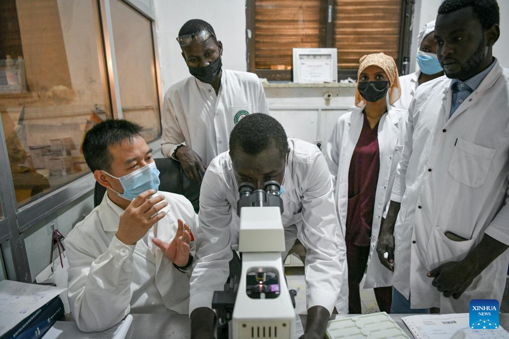 Chinese doctor Wang Zhi, a member of the 20th Chinese medical team to Chad, helps local medical staff with histopathological section diagnosis at the China-Chad Friendship Hospital in N'Djamena, Chad, Jan. 9, 2025.