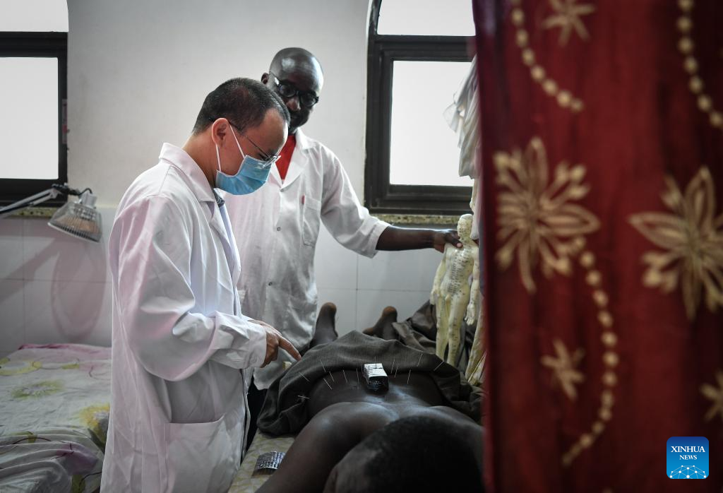Chinese doctor Xie Nengxiang, a member of the 20th Chinese medical team to Chad, performs acupuncture treatment for a patient at the China-Chad Friendship Hospital in N'Djamena, Chad, Jan. 9, 2025.