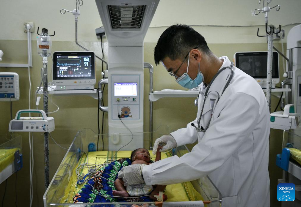 Chinese doctor Xu Kangnan, a member of the 20th Chinese medical team to Chad, examines the condition of a newborn at the China-Chad Friendship Hospital in N'Djamena, Chad, Jan. 9, 2025.