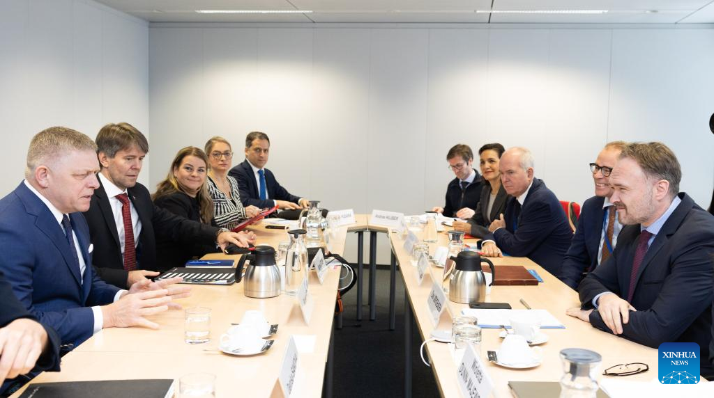 Slovak Prime Minister Robert Fico (1st L) meets with European Union (EU) Energy Commissioner Dan Jorgensen (1st R) in Brussels, Belgium, on Jan. 9, 2025. Slovak Prime Minister Robert Fico said here on Thursday that his government might consider halting humanitarian aid to Ukraine as part of measures in response to the ongoing Russian gas transit dispute. (European Union/Handout via Xinhua)