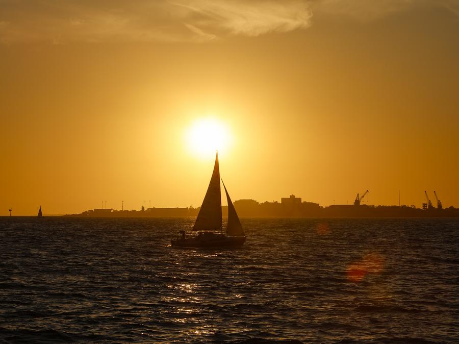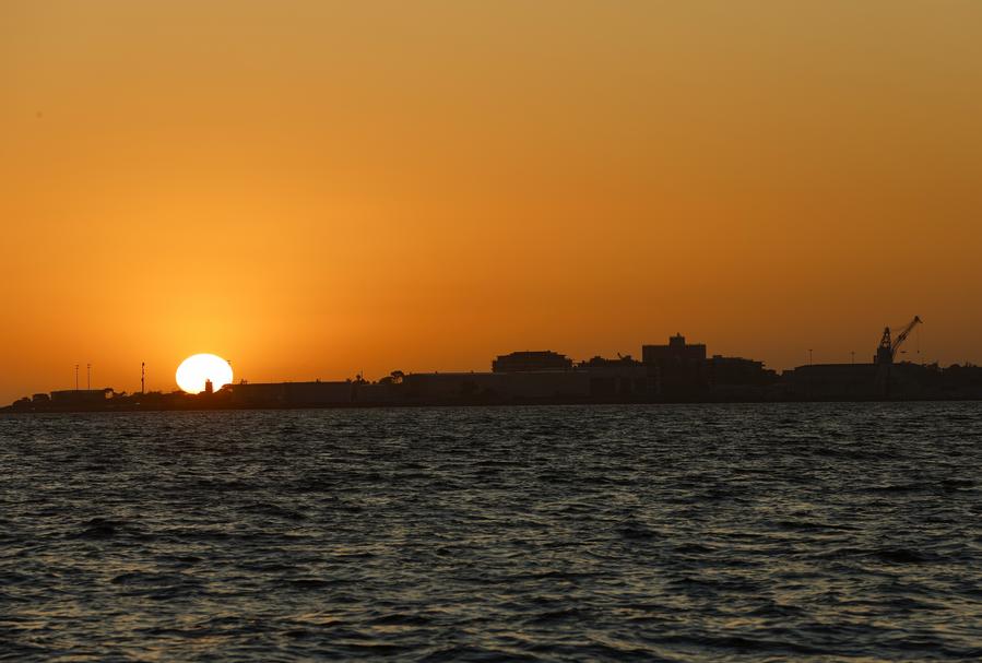 A sailing boat is seen during sunset off the Port Melbourne Beach in Melbourne, Australia, Jan. 10, 2025. (Xinhua/Ma Ping)