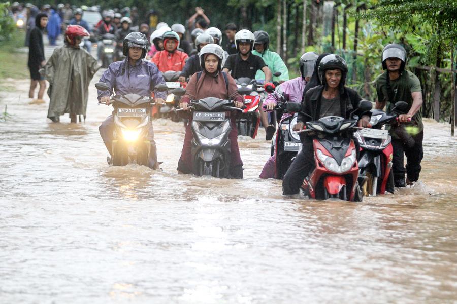 Motorists wade through flood water after heavy rain hit Tanjungpinang, the capital of Riau Islands province, Indonesia, Jan. 11, 2025. (Photo by Yuli Seperi/Xinhua)