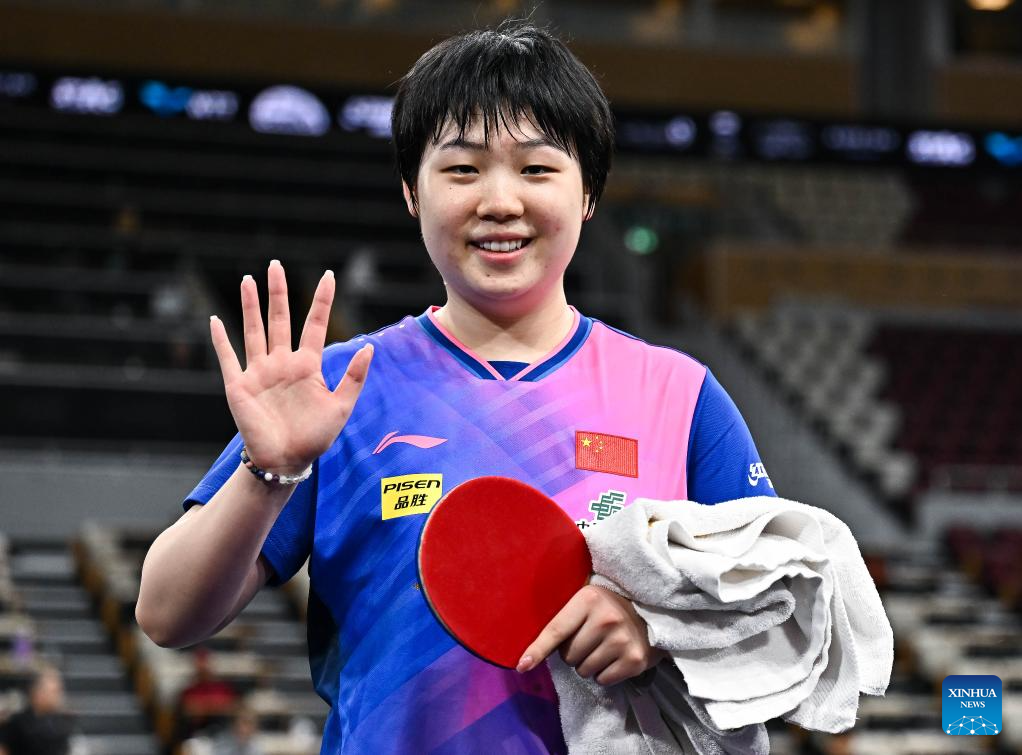 Kuai Man poses for photos after the women's final between Kihara Miyuu of Japan and Kuai Man of China at WTT Star Contender Doha 2025 in Doha, Qatar, Jan. 11, 2025. (Photo by Nikku/Xinhua)