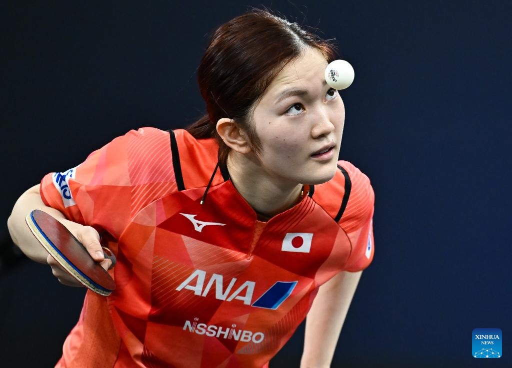 Miyuu Kihara serves during the women's final between Kihara Miyuu of Japan and Kuai Man of China at WTT Star Contender Doha 2025 in Doha, Qatar, Jan. 11, 2025. (Photo by Nikku/Xinhua)