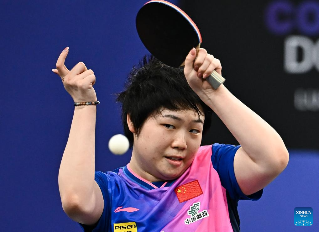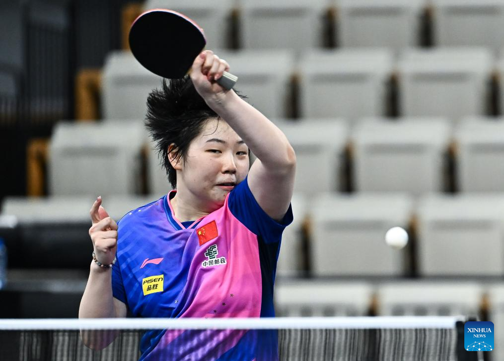 Kuai Man hits a return during the women's final between Kihara Miyuu of Japan and Kuai Man of China at WTT Star Contender Doha 2025 in Doha, Qatar, Jan. 11, 2025. (Photo by Nikku/Xinhua)