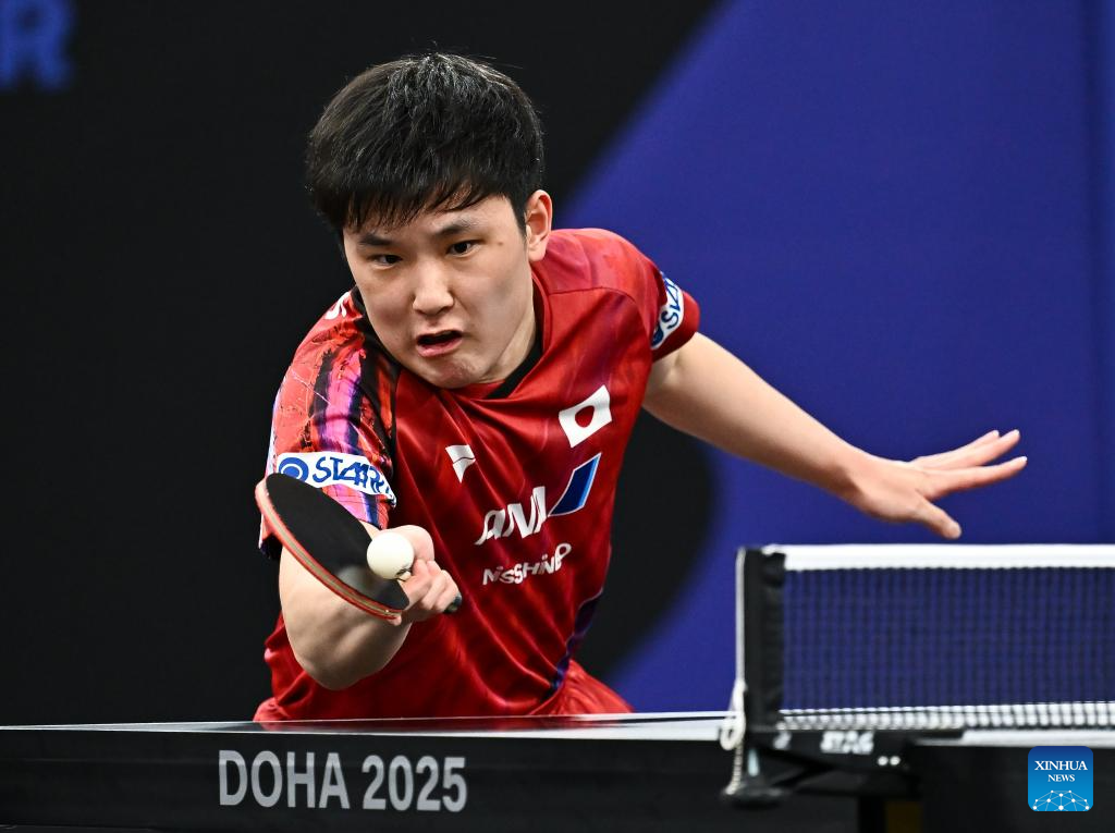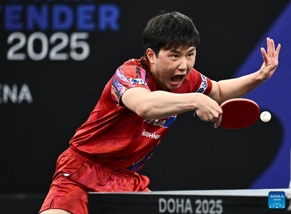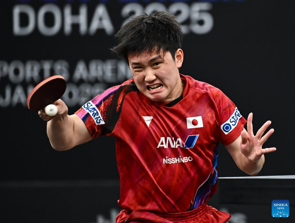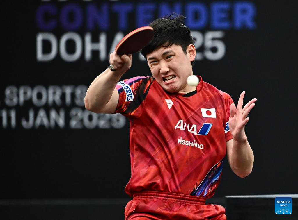 Harimoto Tomokazu hits a return during the men's final between Harimoto Tomokazu of Japan and Jonathan Groth of Denmark at WTT Star Contender Doha 2025 in Doha, Qatar, Jan. 11, 2025. (Photo by Nikku/Xinhua)
