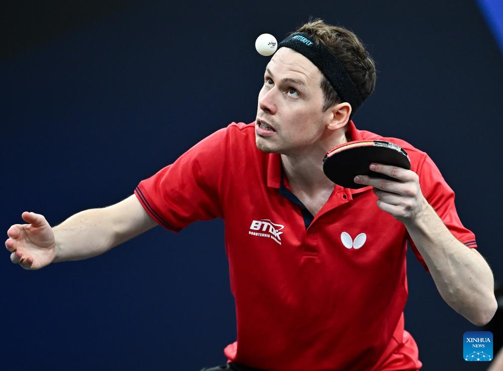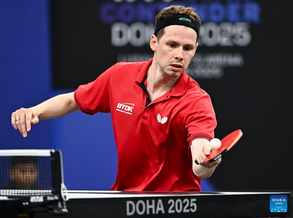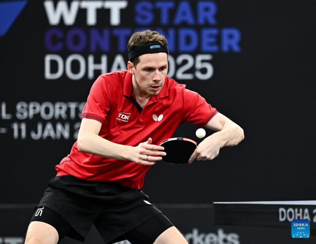 Jonathan Groth hits a return during the men's final between Harimoto Tomokazu of Japan and Jonathan Groth of Denmark at WTT Star Contender Doha 2025 in Doha, Qatar, Jan. 11, 2025. (Photo by Nikku/Xinhua)