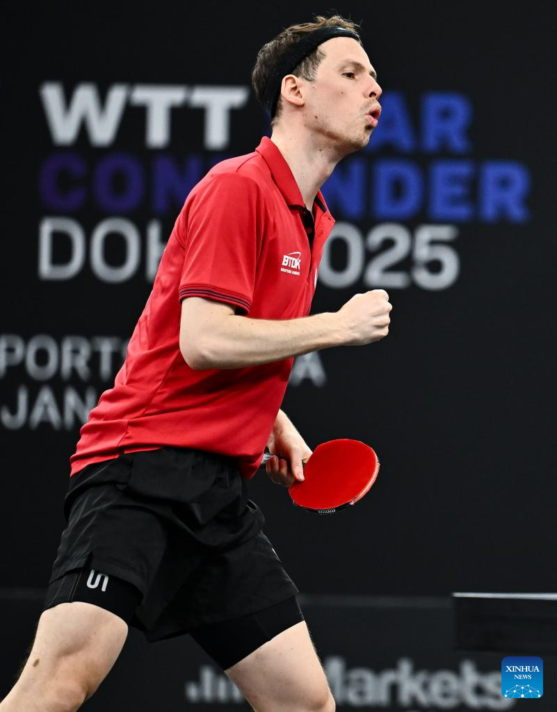 Jonathan Groth celebrates scoring during the men's final between Harimoto Tomokazu of Japan and Jonathan Groth of Denmark at WTT Star Contender Doha 2025 in Doha, Qatar, Jan. 11, 2025. (Photo by Nikku/Xinhua)
