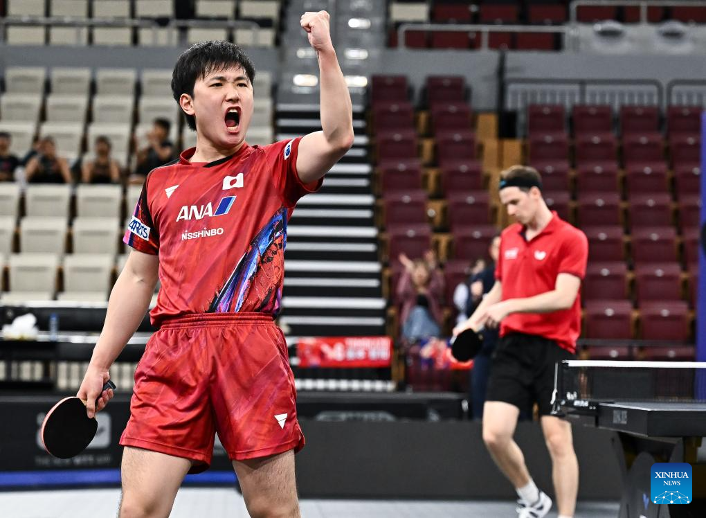 Harimoto Tomokazu celebrates during the men's final between Harimoto Tomokazu of Japan and Jonathan Groth of Denmark at WTT Star Contender Doha 2025 in Doha, Qatar, Jan. 11, 2025. (Photo by Nikku/Xinhua)