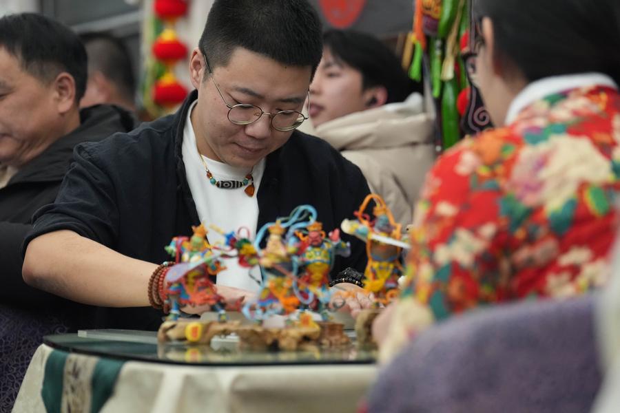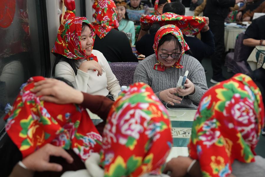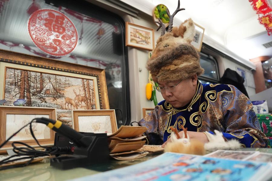 Passengers watch a performance on train K7041 from Harbin to Mohe, northeast China's Heilongjiang Province, Jan. 11, 2025. (Xinhua/Wang Song)Kang Jian, inheritor of a dough figurine making technique, shows his works on train K7041 from Harbin to Mohe, northeast China's Heilongjiang Province, Jan. 11, 2025. (Xinhua/Wang Song)Kang Jian, inheritor of a dough figurine making technique, shows his skills on train K7041 from Harbin to Mohe, northeast China's Heilongjiang Province, Jan. 11, 2025. (Xinhua/Wang Song)Liu Jinxin, inheritor of an embroidery technique, talks with passengers on train K7041 from Harbin to Mohe, northeast China's Heilongjiang Province, Jan. 11, 2025. (Xinhua/Wang Song)Wang Jiayue, an inheritor of intangible cultural heritage, plays a traditional instrument on train K7041 from Harbin to Mohe, northeast China's Heilongjiang Province, Jan. 11, 2025. (Xinhua/Wang Song)Du Hui, inheritor of a birch bark pyrography making technique, makes a piece of birch bark pyrography on train K7041 from Harbin to Mohe, northeast China's Heilongjiang Province, Jan. 11, 2025. (Xinhua/Wang Song)Du Hui, inheritor of a birch bark pyrography making technique, makes a piece of birch bark pyrography on train K7041 from Harbin to Mohe, northeast China's Heilongjiang Province, Jan. 11, 2025. (Xinhua/Wang Song)■