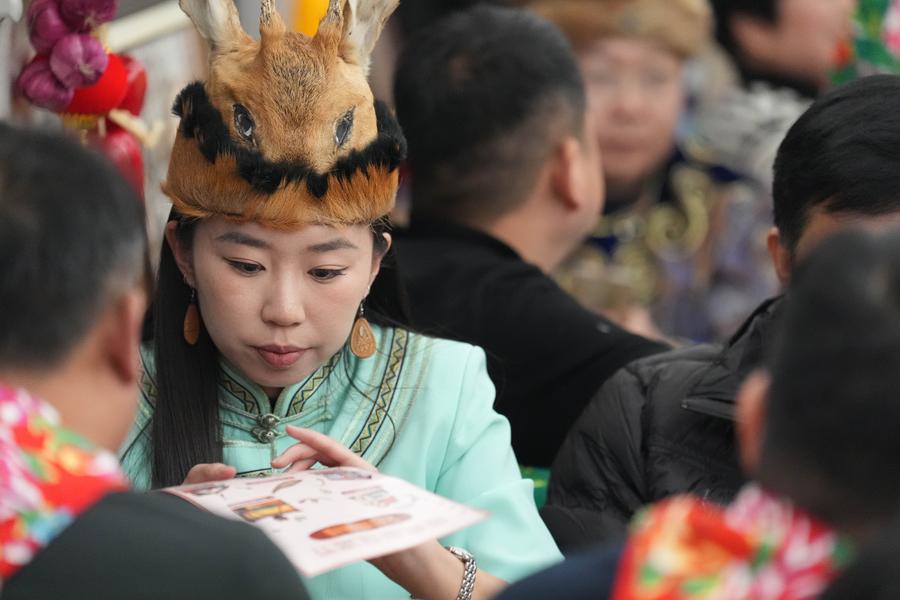 HARBIN, Jan. 12 (Xinhua) -- On train K7041 from Harbin to Mohe, five inheritors of intangible cultural heritages of the Oroqen ethnic group showcased various traditional crafts to passengers. This train marks the first of its kind operated by China Railway Harbin Group Co., Ltd.