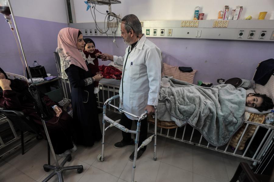GAZA, Jan. 12 (Xinhua) -- Dr. Khaled al-Saidani moves deliberately between hospital beds at Al-Aqsa Hospital's pediatric ward, his prosthetic leg a testament to the personal toll of a war that has devastated Gaza's medical system. For him, the choice to continue practicing medicine, even after losing his leg to an Israeli airstrike, wasn't really a choice at all.