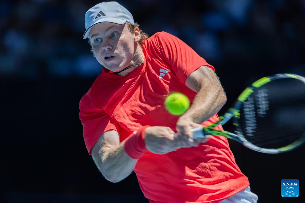 Alex Michelsen hits a return during the men's singles first round match between Stefanos Tsitsipas of Greece and Alex Michelsen of the United States at Australian Open tennis tournament in Melbourne, Australia, Jan. 13, 2025. (Photo by Hu Jingchen/Xinhua)