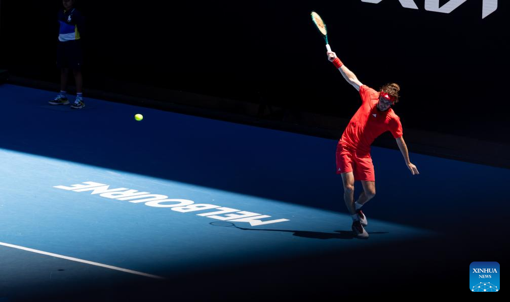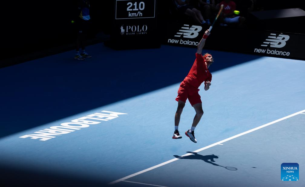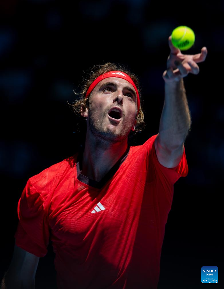 Stefanos Tsitsipas serves during the men's singles first round match between Stefanos Tsitsipas of Greece and Alex Michelsen of the United States at Australian Open tennis tournament in Melbourne, Australia, Jan. 13, 2025. (Photo by Hu Jingchen/Xinhua)