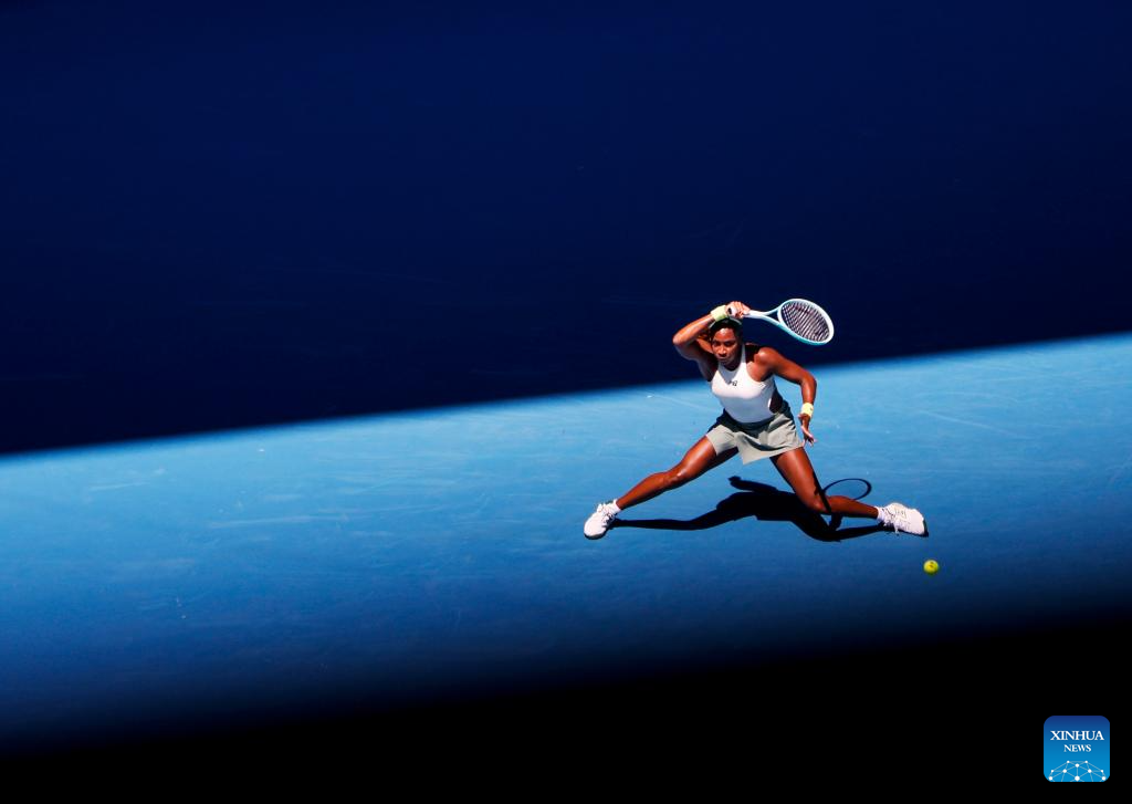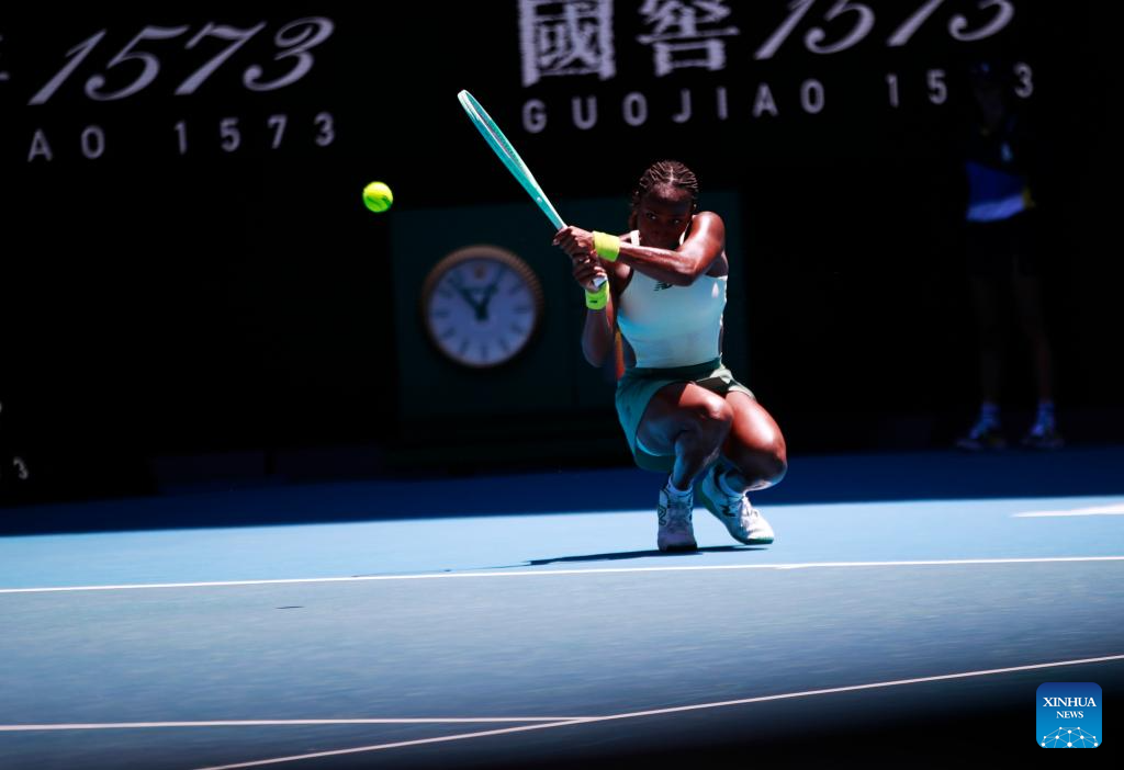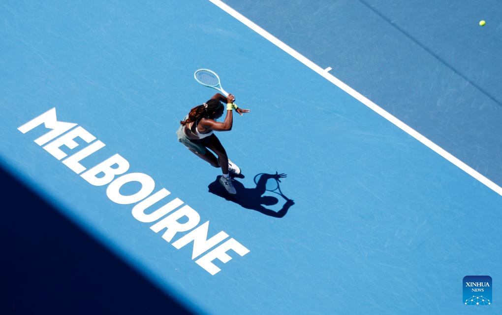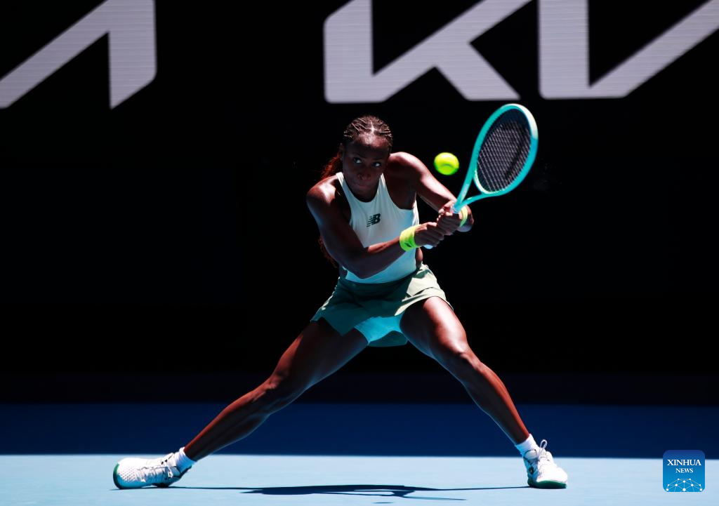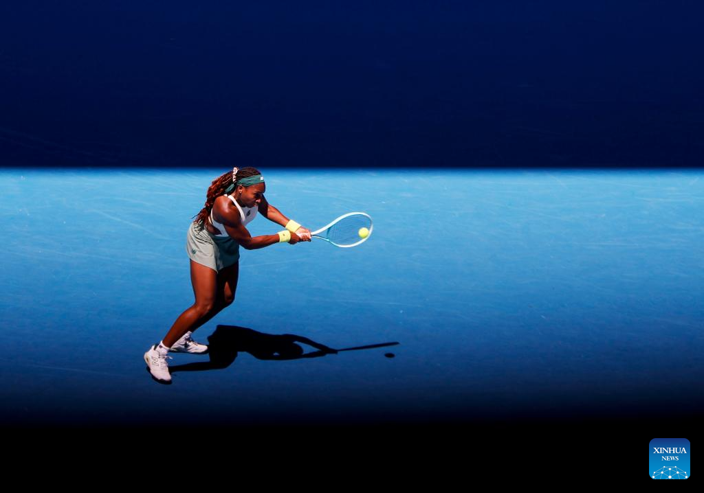 Coco Gauff hits a return during the women's singles first round match between Coco Gauff and Sofia Kenin of the United States at Australian Open tennis tournament in Melbourne, Australia, Jan. 13, 2025. (Xinhua/Ma Ping)