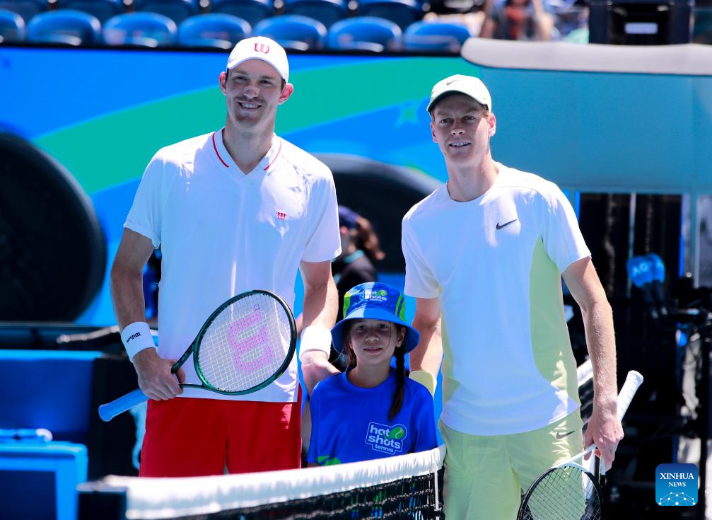 Jannik Sinner (R) and Nicolas Jarry pose for photos before the men's singles first round match between Jannik Sinner of Italy and Nicolas Jarry of Chile at Australian Open tennis tournament in Melbourne, Australia, Jan. 13, 2025. (Xinhua/Ma Ping)