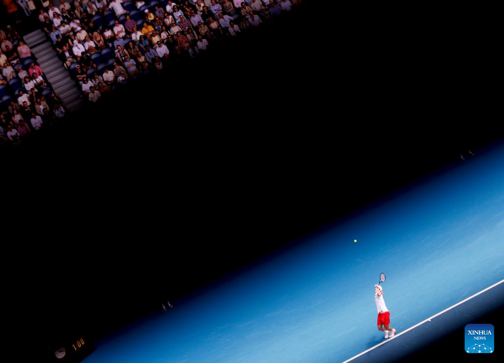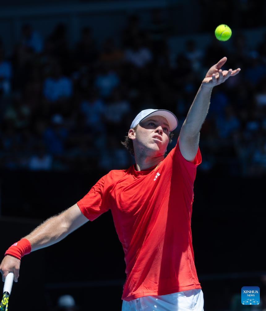 Alex Michelsen serves during the men's singles first round match between Stefanos Tsitsipas of Greece and Alex Michelsen of the United States at Australian Open tennis tournament in Melbourne, Australia, Jan. 13, 2025. (Photo by Hu Jingchen/Xinhua)