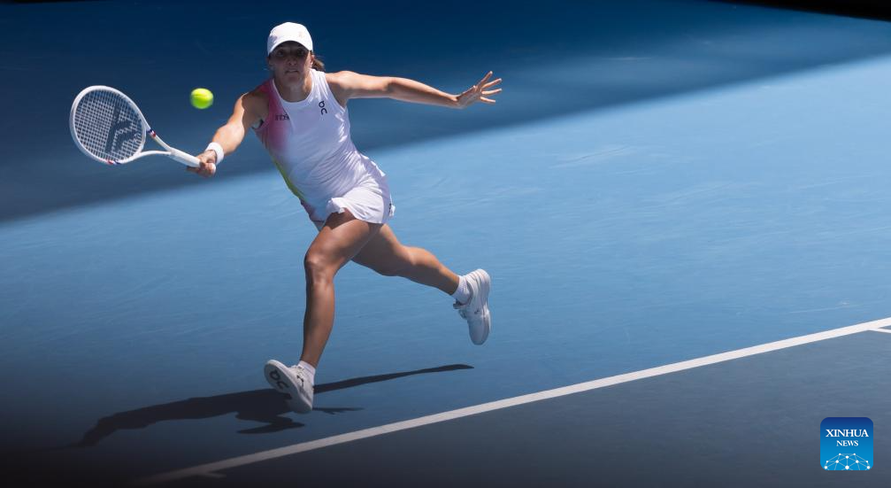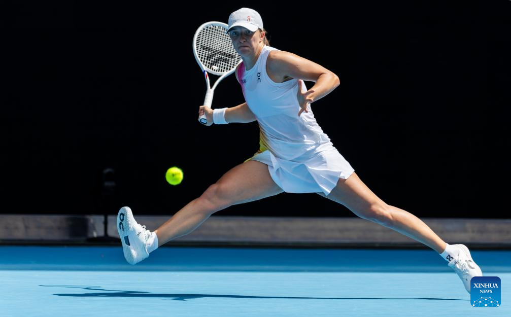 Iga Swiatek hits a return during the women's singles first round match between Iga Swiatek of Poland and Katerina Siniakova of the Czech Republic at Australian Open tennis tournament in Melbourne, Australia, Jan. 13, 2025. (Photo by Hu Jingchen/Xinhua)