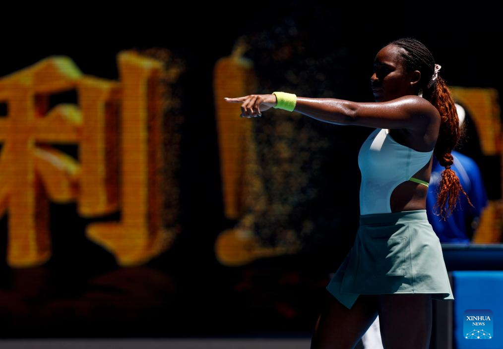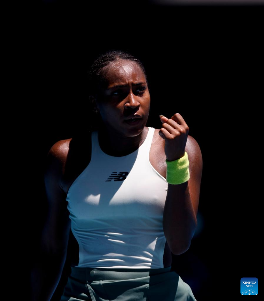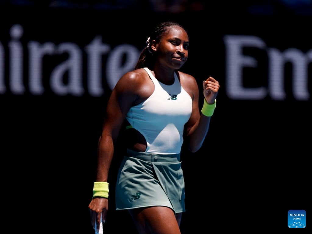 Coco Gauff celebrates winning the women's singles first round match between Coco Gauff and Sofia Kenin of the United States at Australian Open tennis tournament in Melbourne, Australia, Jan. 13, 2025. (Xinhua/Ma Ping)
