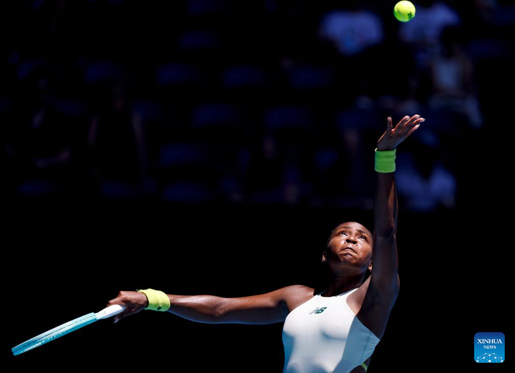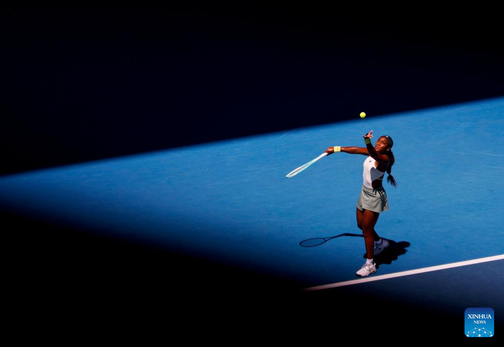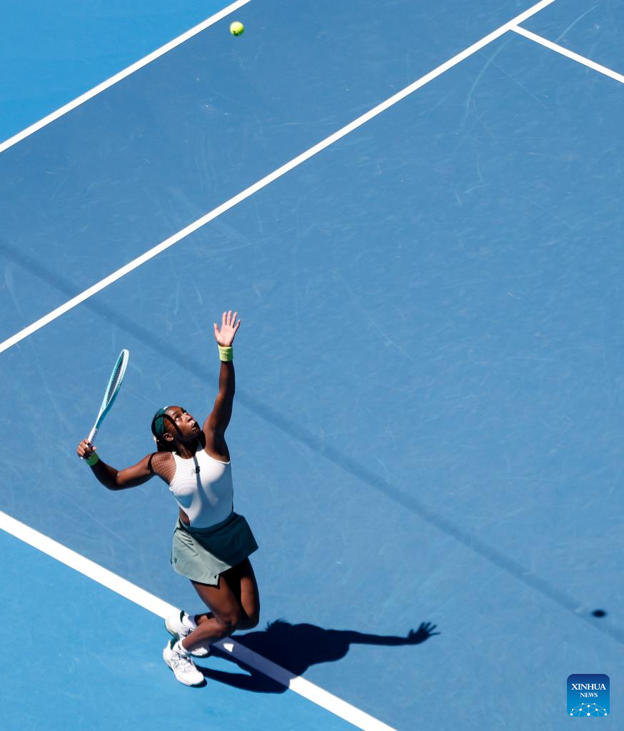 Coco Gauff serves during the women's singles first round match between Coco Gauff and Sofia Kenin of the United States at Australian Open tennis tournament in Melbourne, Australia, Jan. 13, 2025. (Xinhua/Ma Ping)