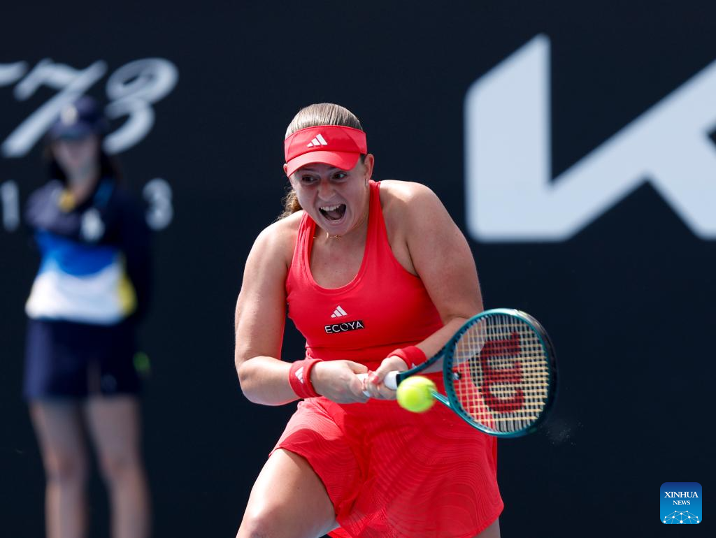 Jelena Ostapenko hits a return during the women's singles first round match between Belinda Bencic of Switzerland and Jelena Ostapenko of Latvia at Australian Open tennis tournament in Melbourne, Australia, Jan. 13, 2025. (Xinhua/Ma Ping)