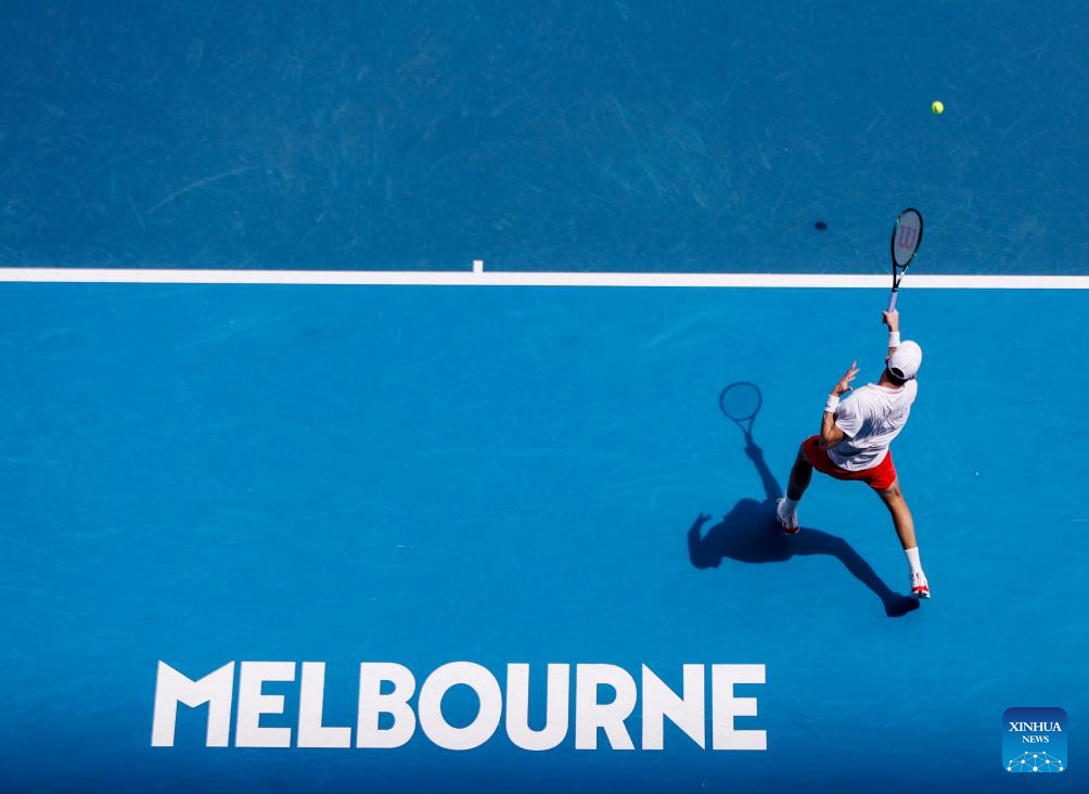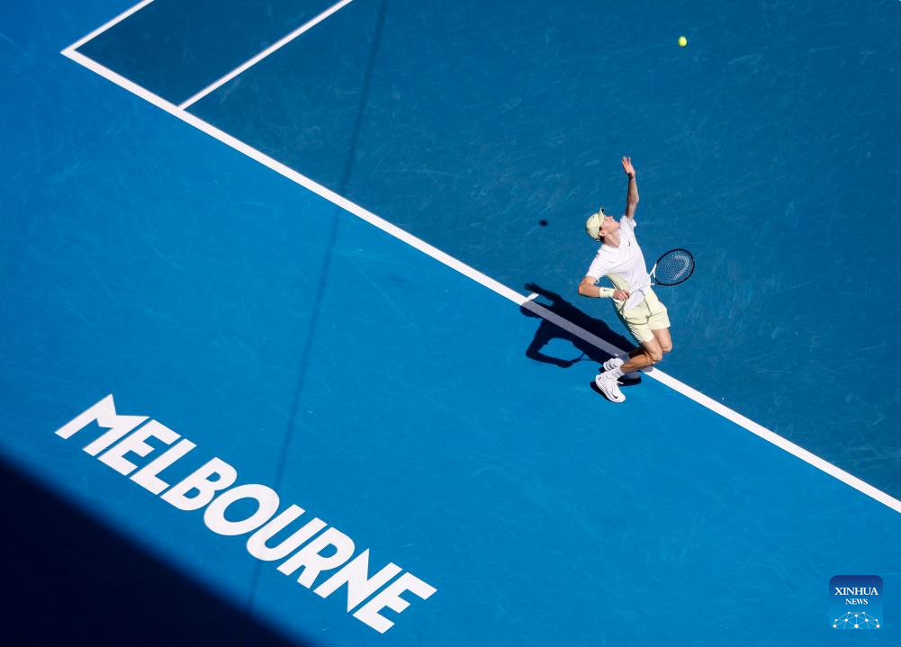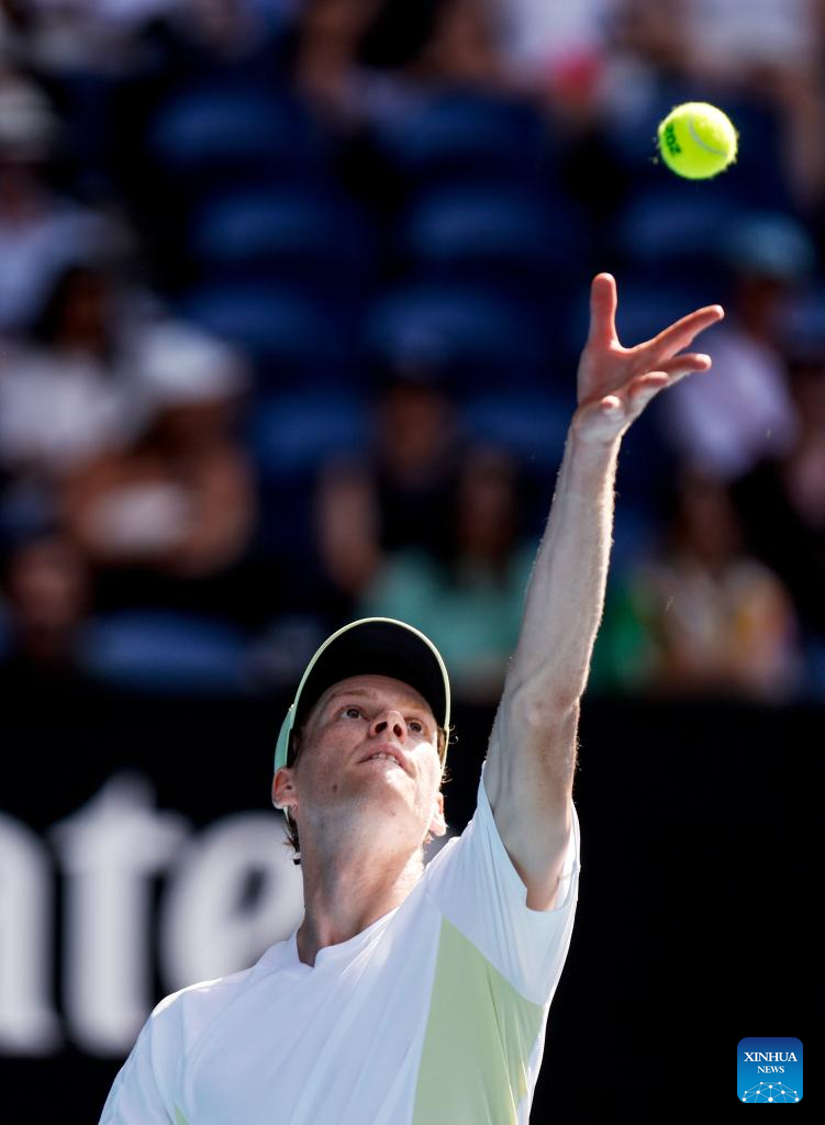 Jannik Sinner serves during the men's singles first round match between Jannik Sinner of Italy and Nicolas Jarry of Chile at Australian Open tennis tournament in Melbourne, Australia, Jan. 13, 2025. (Xinhua/Ma Ping)