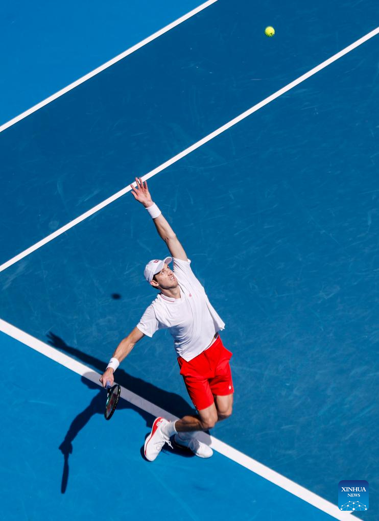 Nicolas Jarry serves during the men's singles first round match between Jannik Sinner of Italy and Nicolas Jarry of Chile at Australian Open tennis tournament in Melbourne, Australia, Jan. 13, 2025. (Xinhua/Ma Ping)