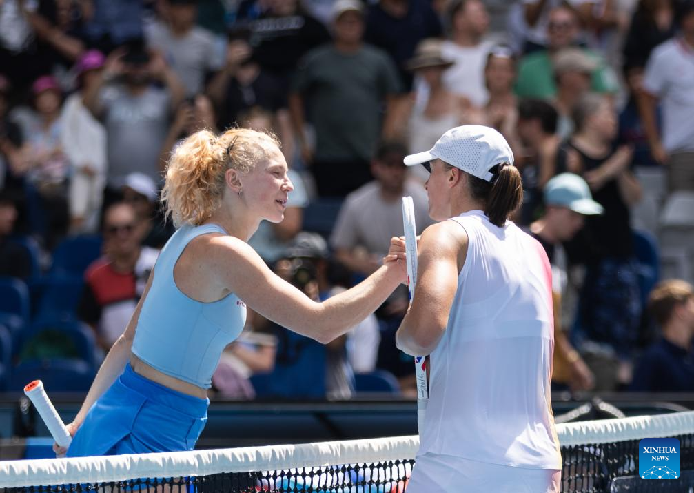 Iga Swiatek (R) shakes hand with Katerina Siniakova after the women's singles first round match between Iga Swiatek of Poland and Katerina Siniakova of the Czech Republic at Australian Open tennis tournament in Melbourne, Australia, Jan. 13, 2025. (Photo by Hu Jingchen/Xinhua)